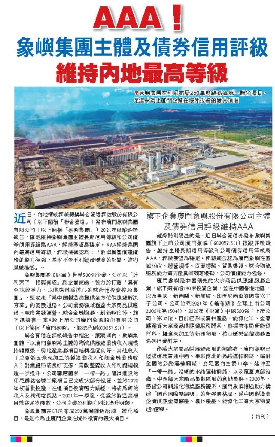 近年來,象嶼積極響應(yīng)國家“一帶一路”倡議,在國際市場開拓、跨境供應(yīng)鏈服務(wù)、國際化運營團(tuán)隊培育等方面不斷發(fā)力,象嶼國際化程度不斷提升引起了國際資本市場的廣泛關(guān)注。昨天,《大公報》、《香港經(jīng)濟(jì)日報》、《大公網(wǎng)》、《經(jīng)濟(jì)通》等多家港媒,發(fā)文聚焦廈門象嶼集團(tuán)有限公司及旗下上市企業(yè)廈門象嶼股份有限公司主體及債券信用評級均維持國內(nèi)最高等級AAA,并詳細(xì)圍繞評級報告介紹了象嶼的業(yè)務(wù)板塊和發(fā)展前景。