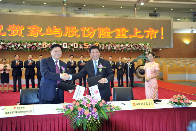 2011年8月29日,福建省廈門象嶼股份有限公司在上海證券交易所舉行隆重的重組上市儀式。廈門市人民政府葉重耕副市長及象嶼股份王龍雛董事長共同敲鑼開盤。象嶼股份股價高開逾1倍,開盤價8.25元,早市最高漲127.5%。截至早市收盤,報8.29元,漲108.29%。